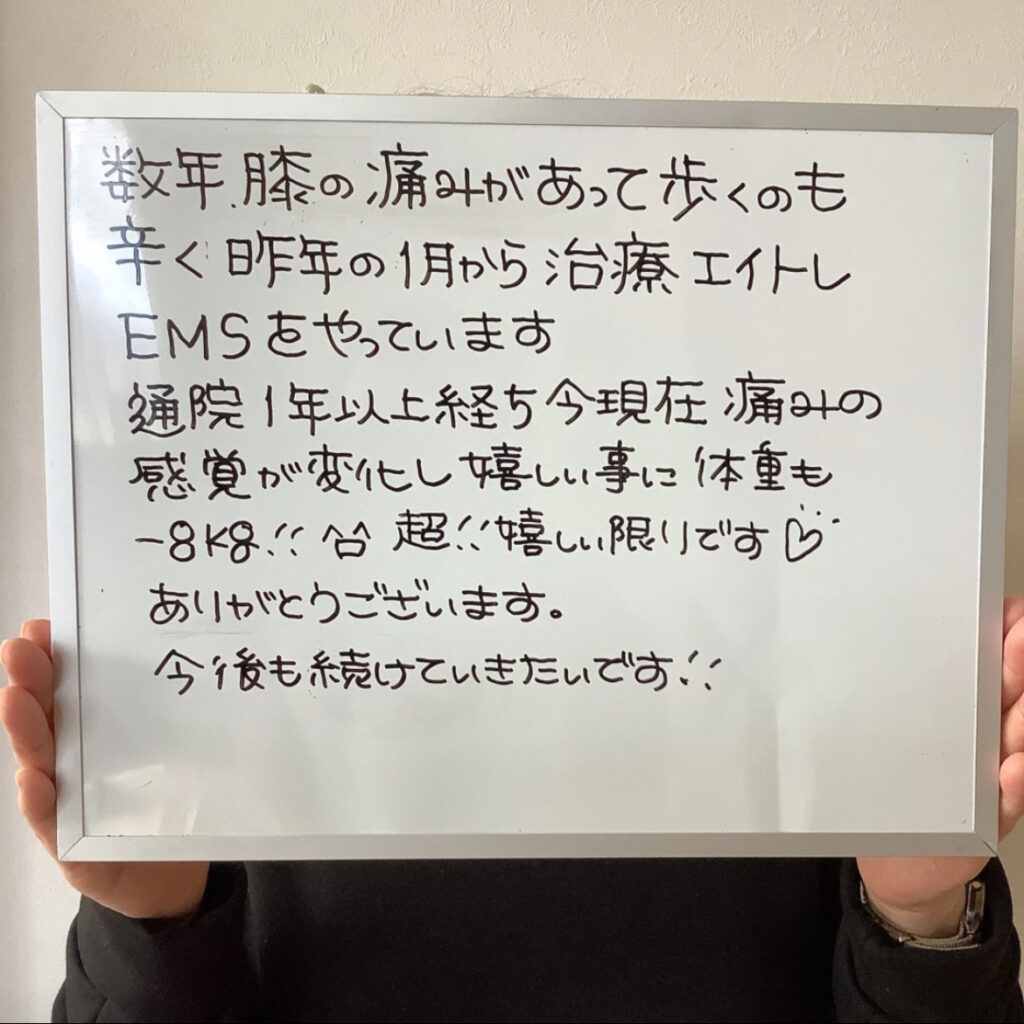 数年膝の痛みがあって歩くのも辛く、昨年の1月から治療、エイトレ、EMSをやっています。
