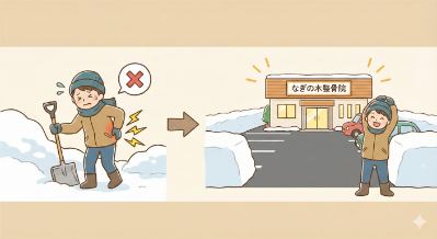 「秋田の冬、雪かきによる急な腰痛・ギックリ腰でお困りの方へ。当日予約枠ございます。駐車場は完璧に除雪済みです。」