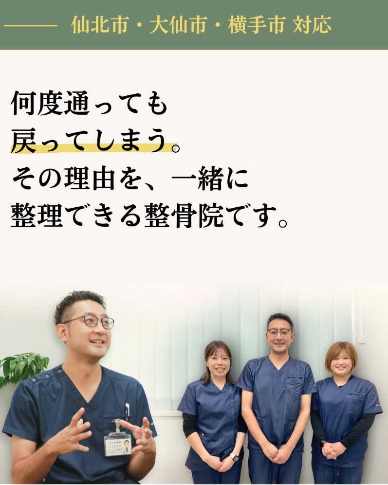 特に、腰痛・肩こり・しびれ・姿勢のお悩みで大仙市から来院される方もいらっしゃいます。